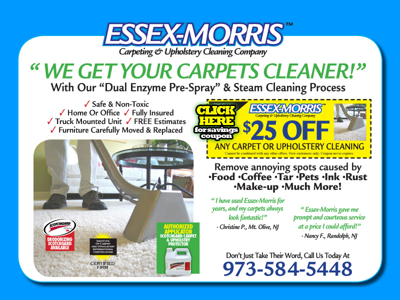 We can remove those spots and stains that bother you everyday. Food, Coffee, Tar, Pets, Ink, Rust, Make-up. Remember, we get your carpets cleaner with our custom dual enzyme pre-spray and steam cleaning process. Our carpet and upholstery cleaning system is safe and non-toxic. Our truck mounted unit can be used for home or office cleaning. Furniture is carefully moved and replaced. Just call 973-584-5448 for your FREE estimate and the best cleaning experience you've ever had.